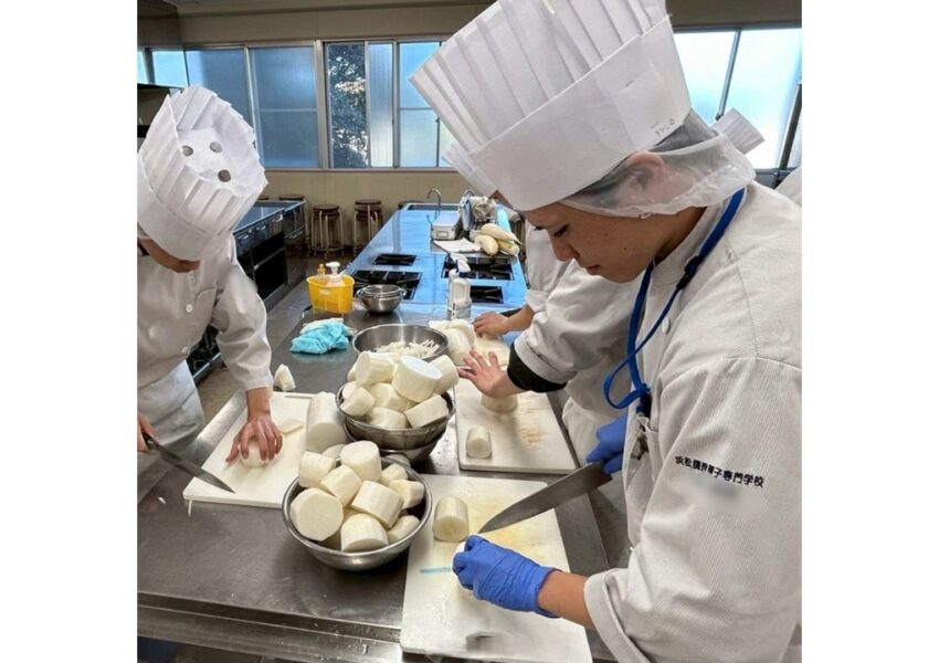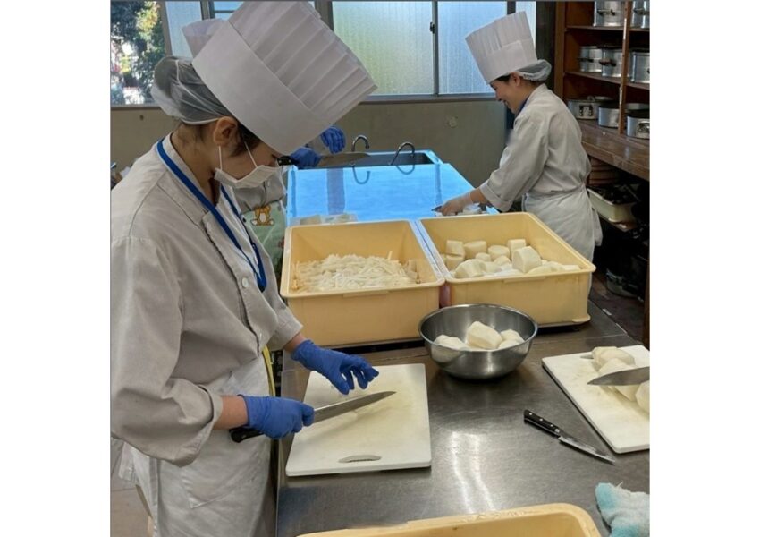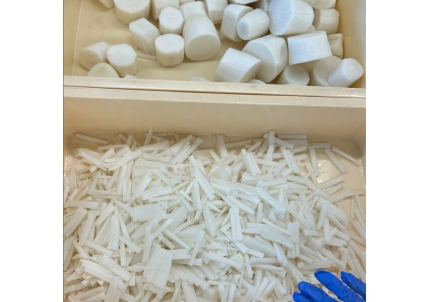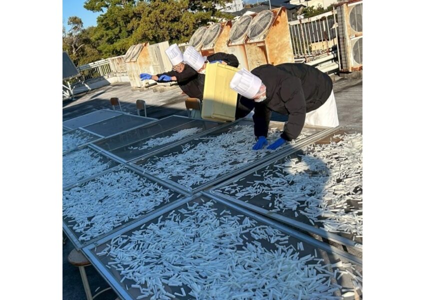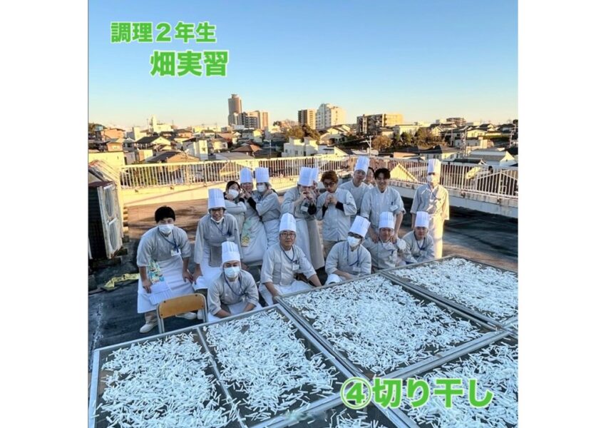 2025/12/25 授業日記調理師科 授業日記切り干し大根作り畑実習続き⭐︎ たくさん収穫した大根の一部は切り干し大根に! 大根を切って天日干し☀️☀️大根は乾燥させることで大根の甘みと旨みが凝縮され、栄養価も高まります✨製造した切り干し大根は今後授業や食育活動で大活躍👩🏻🍳🍝 2月の卒業作品展では一部販売予定🫶🏻完成が楽しみです〜😊