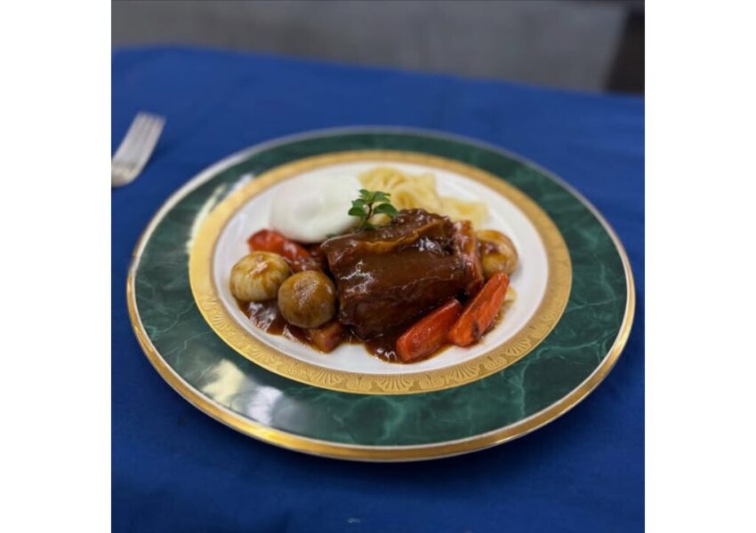 2026/01/20 授業日記調理師科 授業日記牛バラ肉の赤ワイン煮圧力鍋を使って1時間煮込み、ほろほろとやわらかに仕上げました🍴 濃厚なデミグラスソースでさらに煮込み、ポーチドエッグやパスタを添えた、贅沢な一皿です♡