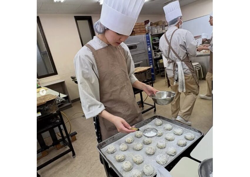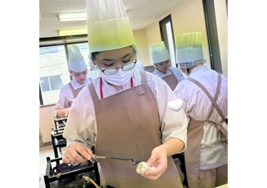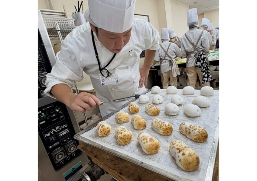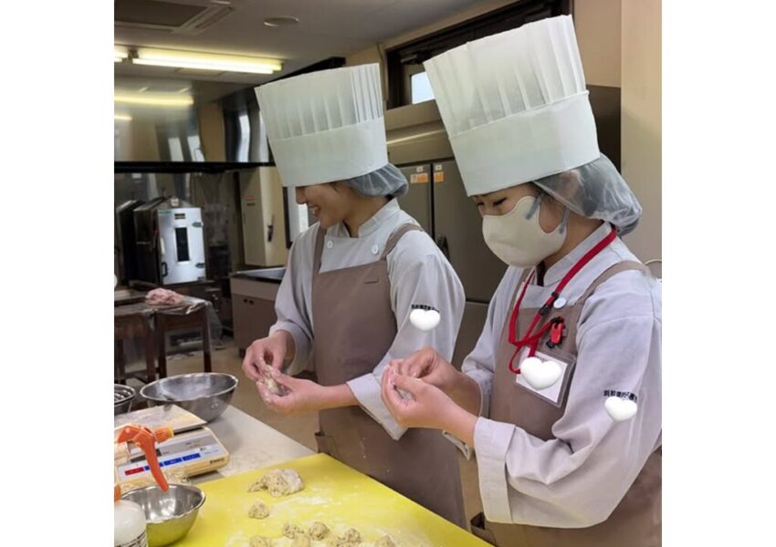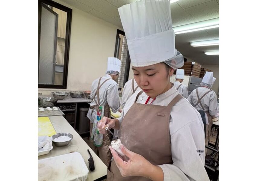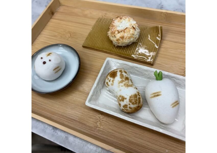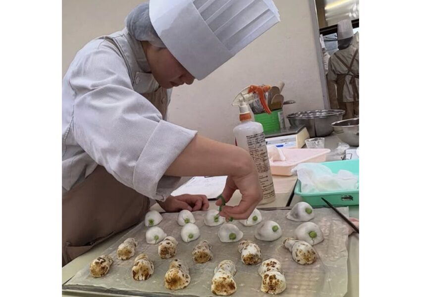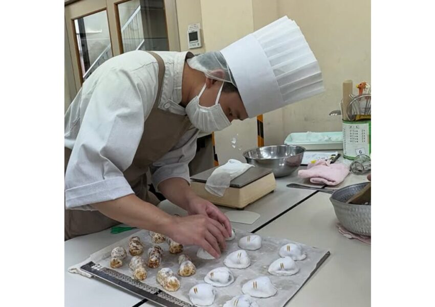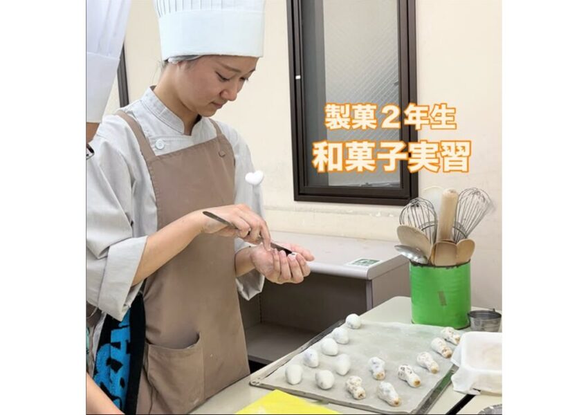2025/10/17 授業日記製菓衛生師科 授業日記製菓2年生 和菓子実習『薯蕷饅頭』と『巣ごもり』の2品🧑🏻🍳薯蕷饅頭は大和芋を練り込んだ生地で小豆こしあんを包んだ蒸し饅頭です♨️ふわふわしっとりとした食感が特徴✨ かわいい松茸と大根を成形し、秋冬を表現しました🍂巣ごもりは、黒ゴマ餡を包んでココナッツをまぶしてオーブンで焼き上げました。さっくりほろほろな食感とゴマの風味がたまらない上品な創作和菓子です☺️虎がひょっこり🐅