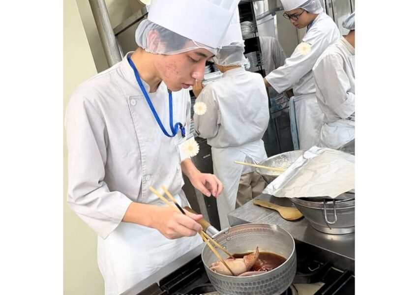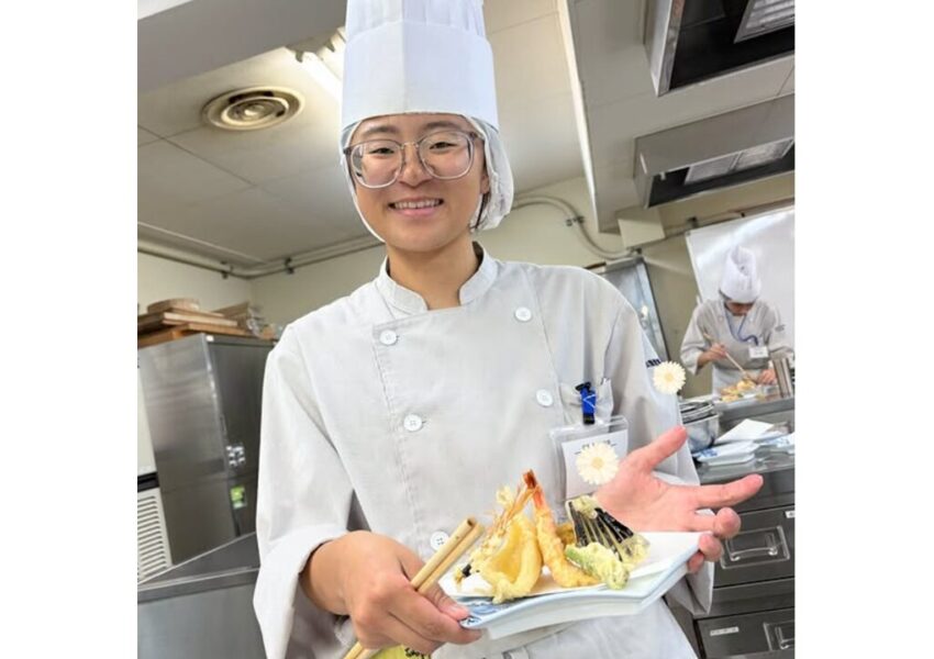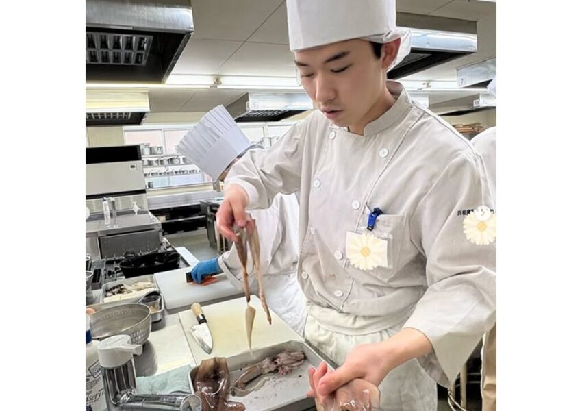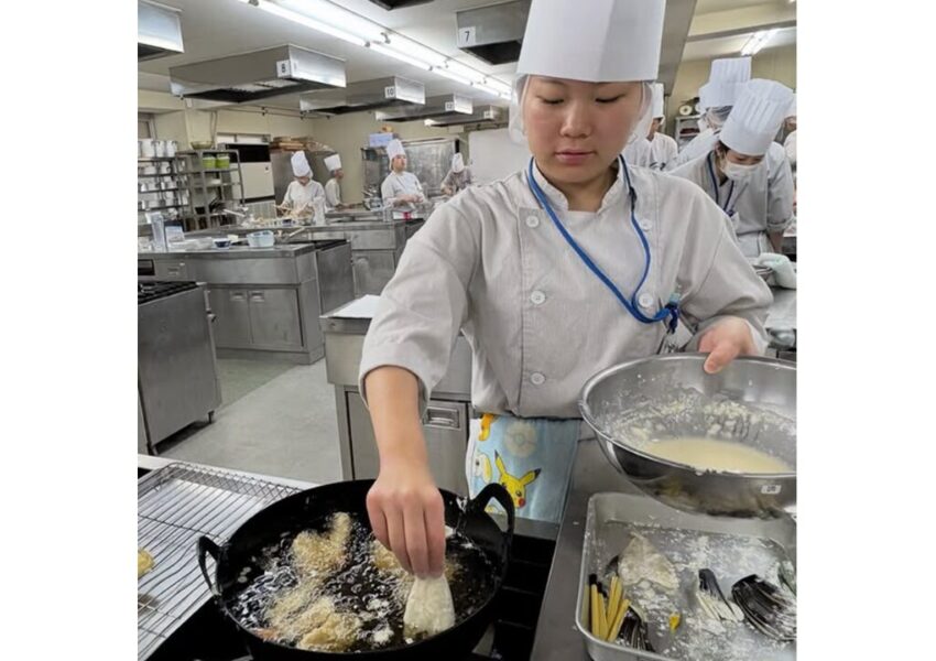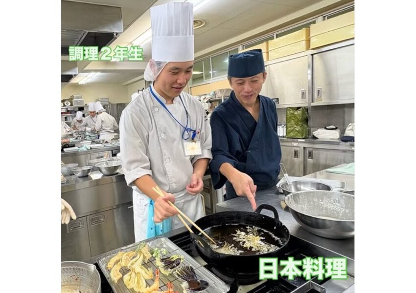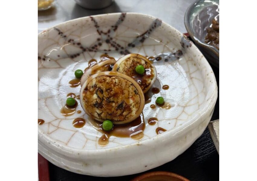 2025/10/20 授業日記調理師科 授業日記調理2年生 日本料理仲村先生の日本料理実習🥢 いかのけんちん煮、季節野菜の天ぷら🧑🏻🍳✨けんちん煮は、豆腐や卵を炒めた『けんちん地』をスルメイカに詰めて煮上げて作ります🦑