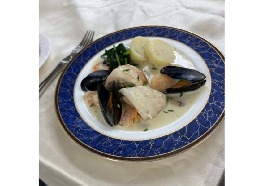 舌平目を各自1尾おろして、海老やムール貝ともにクリーム煮に仕上げました✨