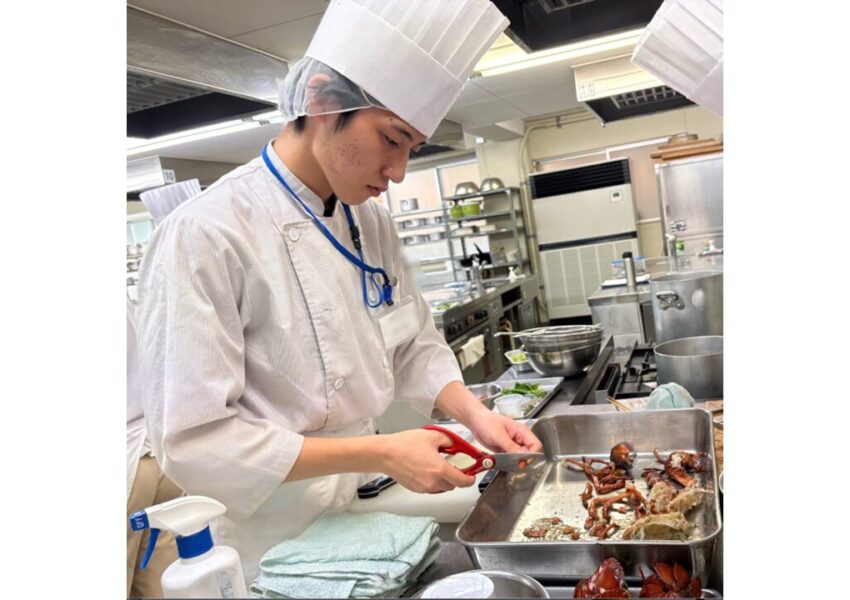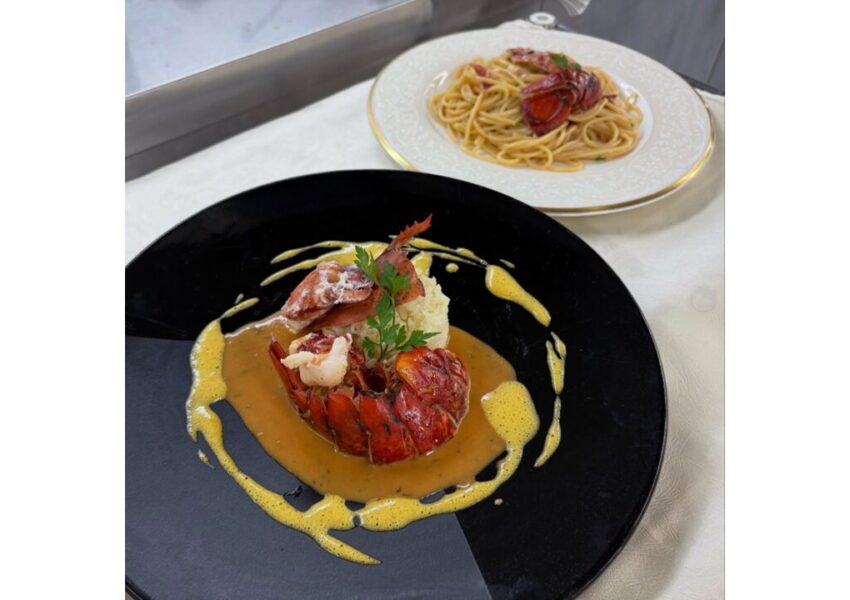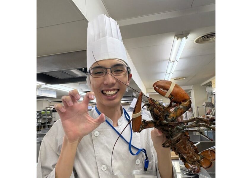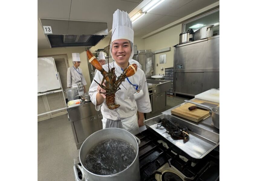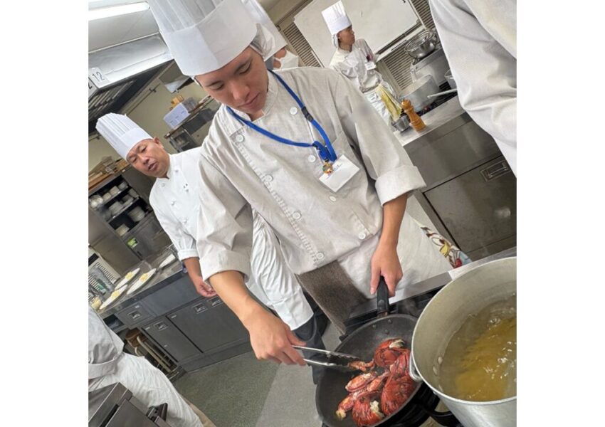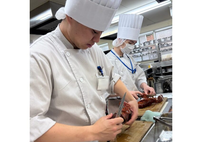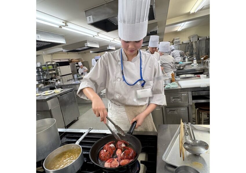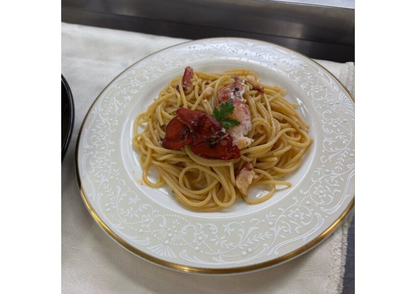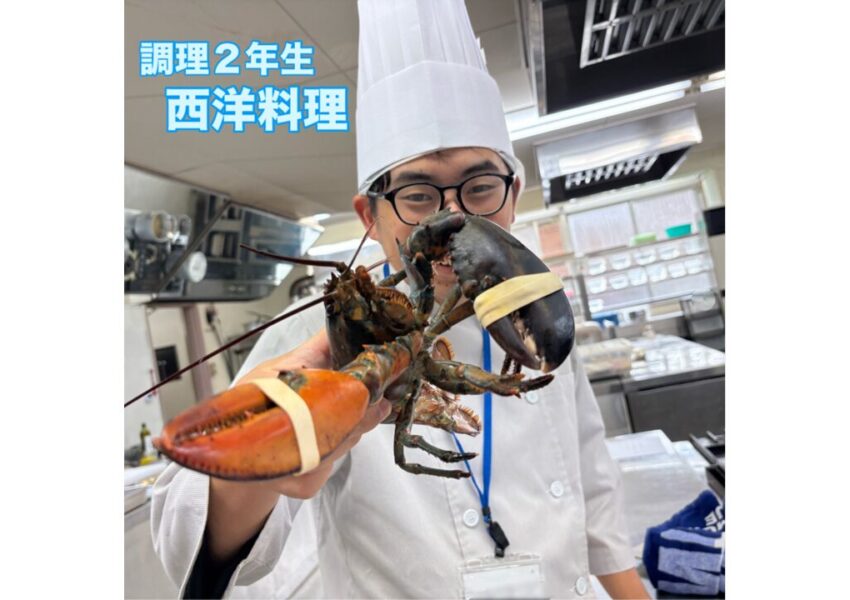2025/12/03 授業日記調理師科 授業日記調理2年生 西洋料理オマール海老のポワレ🦐活きオマールの調理に盛り上がる学生たち😆オマールの殻を使ったアメリケーヌソースと卵黄を使って作るサバイヨンソースを添えて仕上げました🍴✨ アメリケーヌソースを使ったパスタも一緒に♡